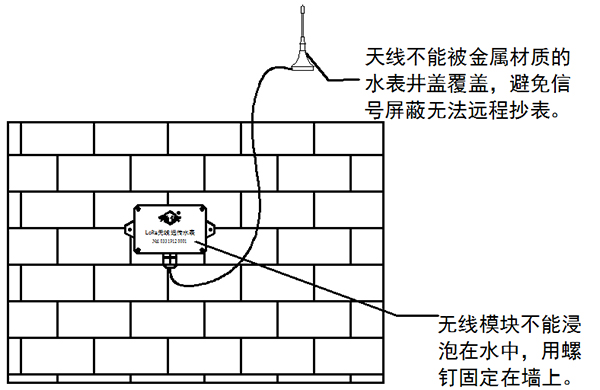 2. 模塊不能浸泡在水中,安裝時(shí)用螺釘固定在牢固墻面,引出天線不能被金屬材質(zhì)的水表井覆蓋,避免信號(hào)屏蔽無(wú)法遠(yuǎn)程抄表。